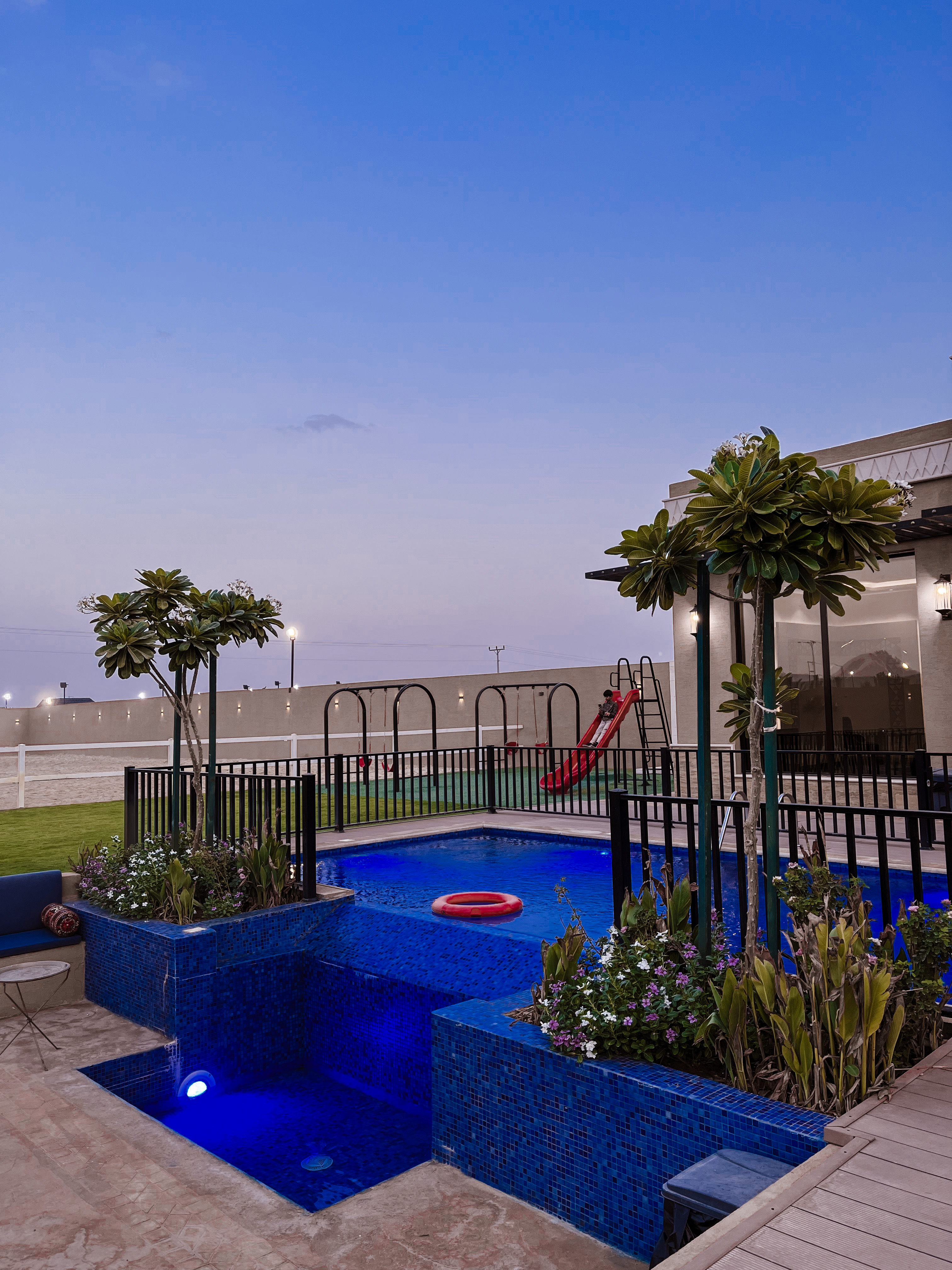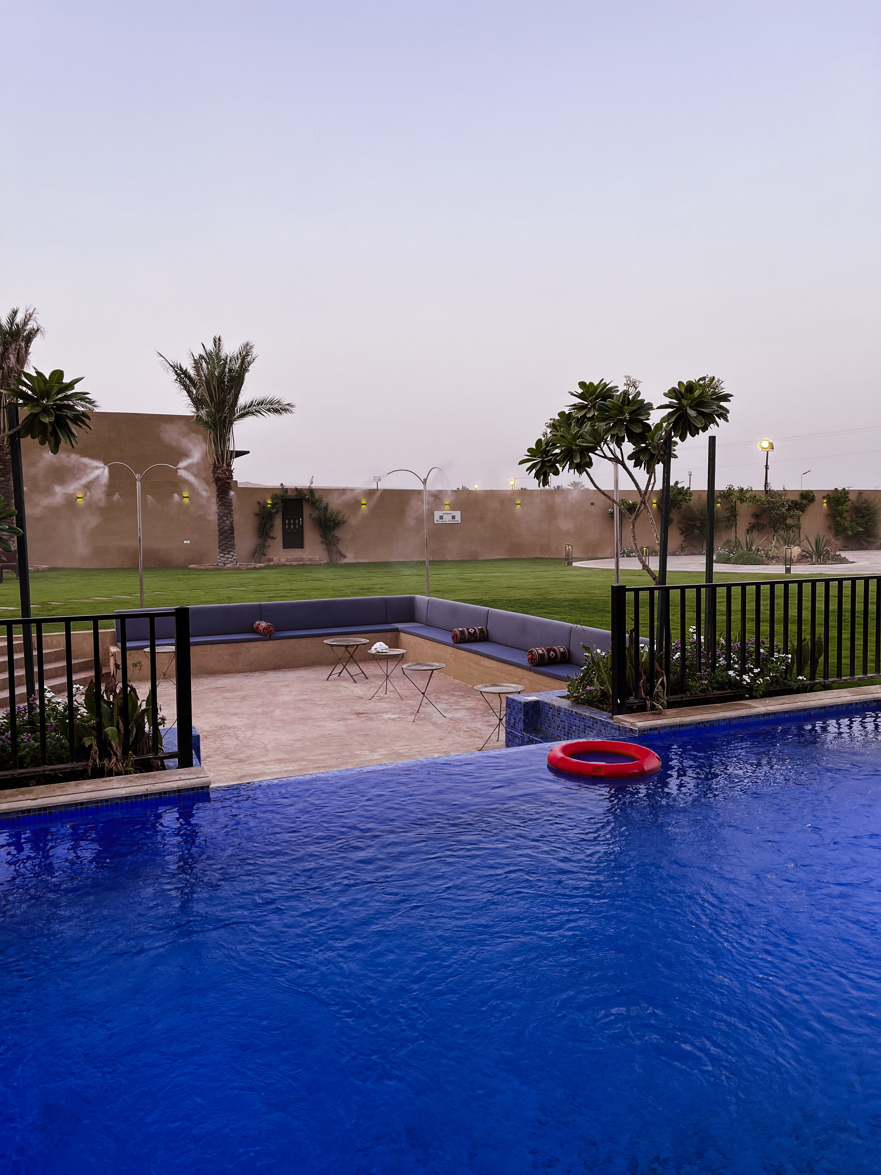 استرخِ بجوار المسبح الخاص في المربط النجدي مع جلسات مظللة وإطلالة على المسطحات الخضراء. تمشَّ بين النخيل أو خذ لحظة انتعاش بعد عروض الخيل. مرافق المسبح والحديقة مصممة لهدوء العائلة وراحة الضيوف.